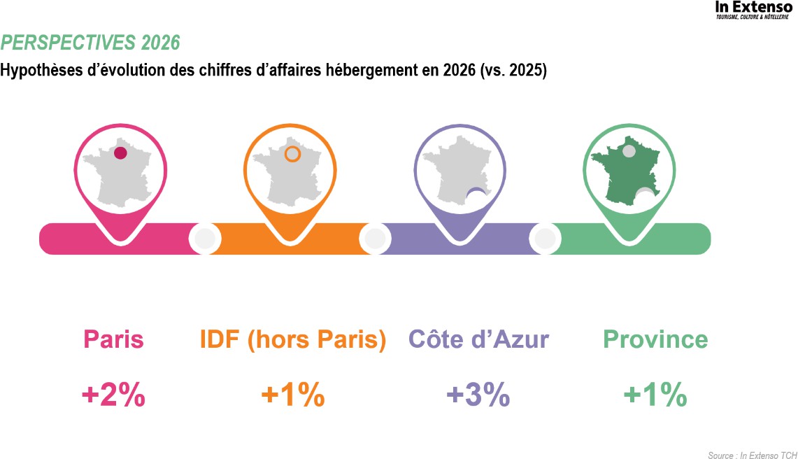 - En Régions, où l’offre reste majoritairement orientée vers la clientèle d’affaires, 2026 s’annonce encore mitigée. Un gain modéré de 1% du RevPAR est ainsi anticipé.