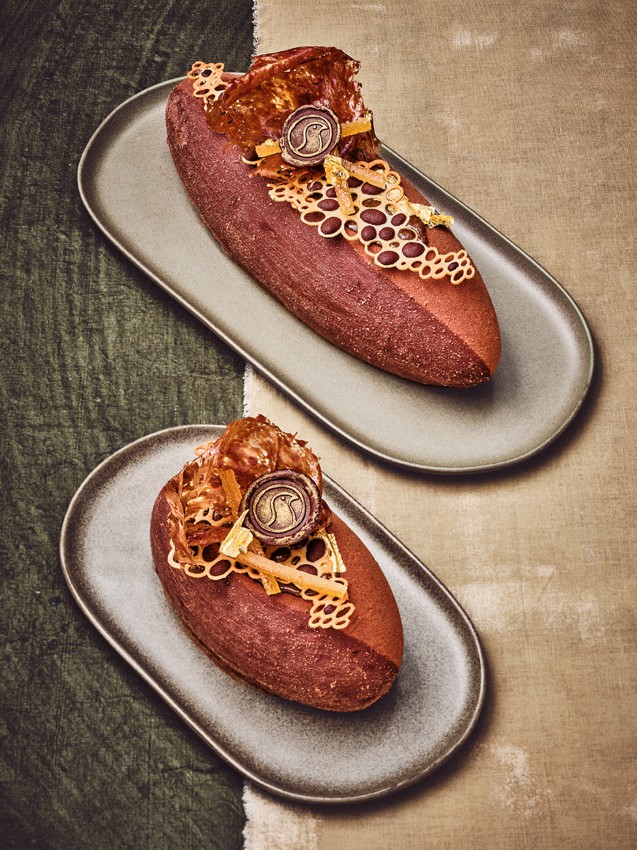 Pièce incontournable des fêtes, la bûche-signature du Chef Pâtissier Romain Marti rend hommage à l’ADN de la maison : élégance, précision et terroir. Modelée comme un grain de café, elle décline café, agrumes, chocolat noir Valrhona 70% Guanaja et praliné maison dans un jeu d’équilibre entre richesse, fraîcheur et amertume.