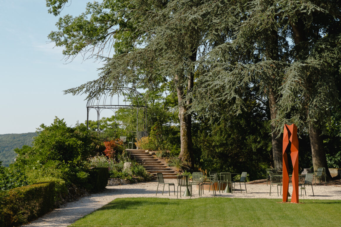Une sculpture monumentale dans les jardins, vestige de l’exposition Vasarely 2024, prolonge ce dialogue entre art et nature.