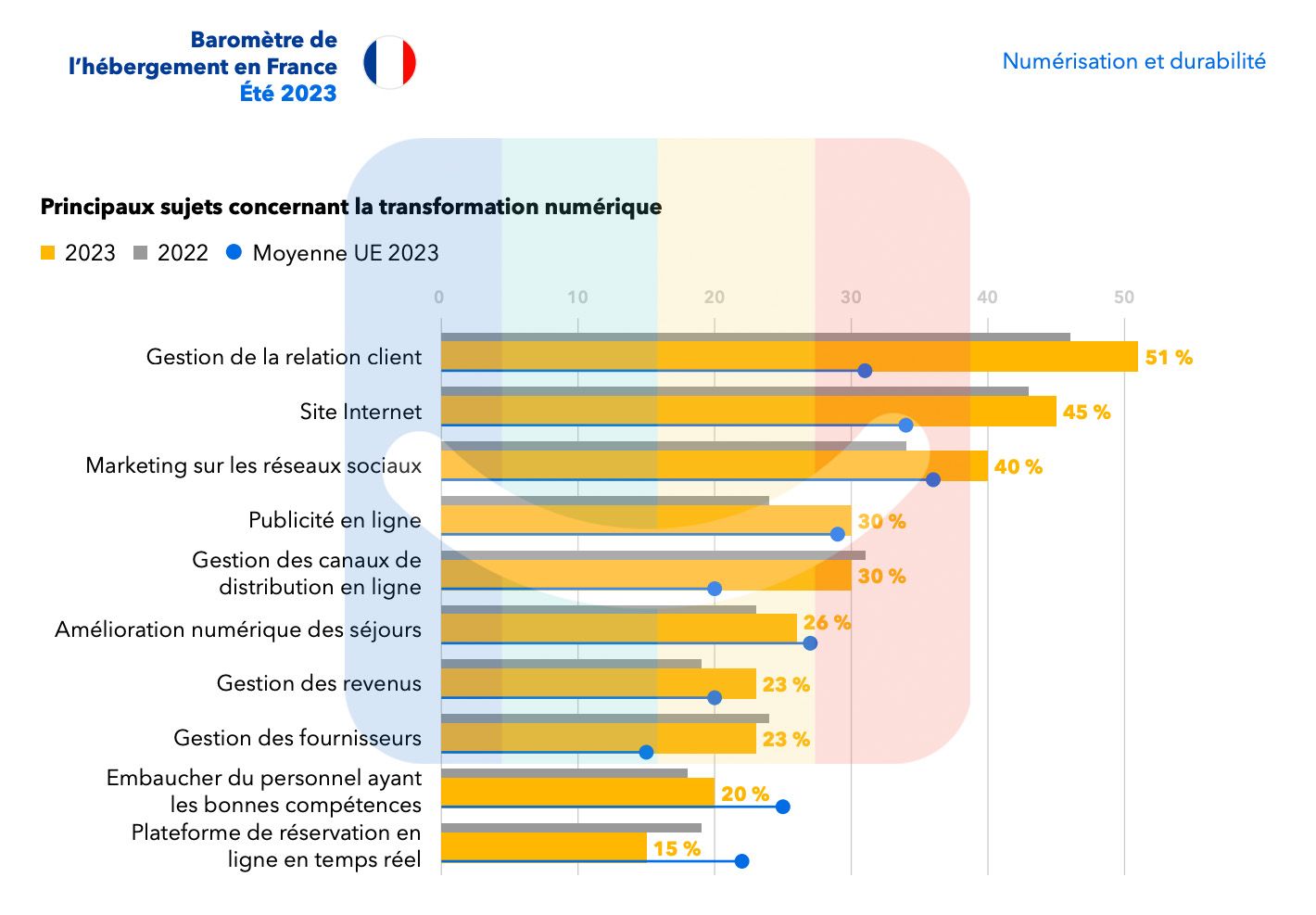 Dans les priorités d’investissements, la numérisation revient en pôle-position dans la plupart des réponses … et pour cause, sans un effort important et constant en matière de “digital”, les hébergeurs passent “à côté de leur marché” et succombent, de plus en plus, à leur invisibilité commerciale; un effet que les chaînes parviennent manifestement à gommer en gérant cette partie pour le compte de leurs succursales comme le montre indirectement cette étude.