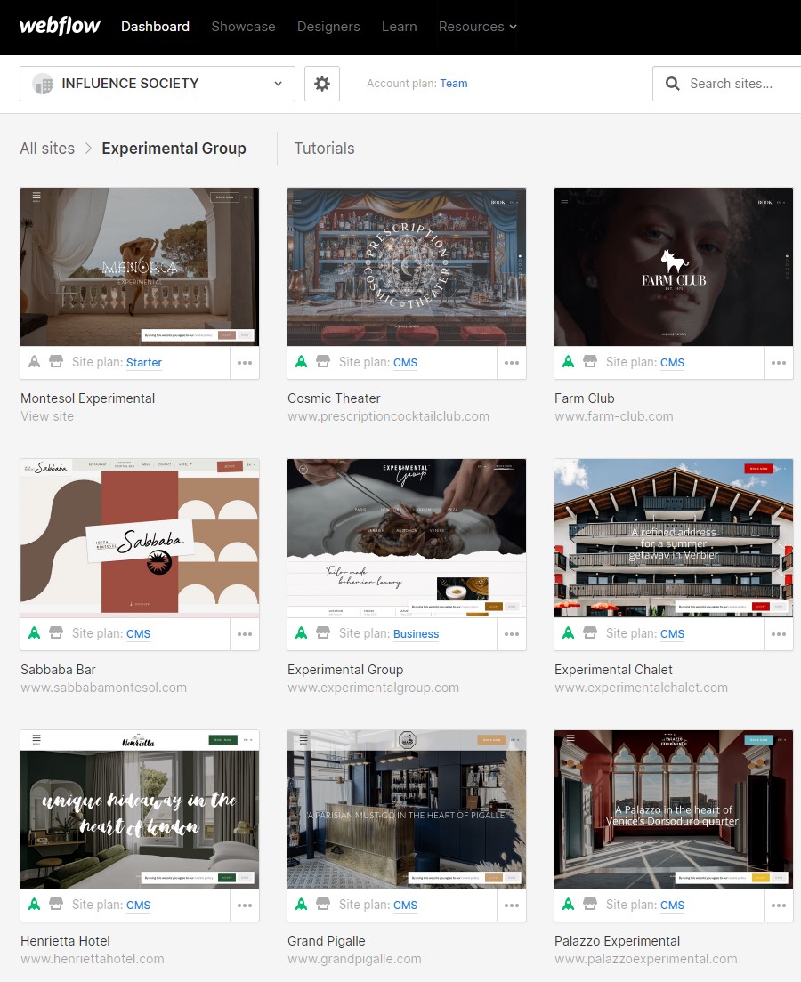 Experimental Group possède un certain nombre de propriétés, toutes avec leur propre style d’entreprise et leur propre ambiance. Ils peuvent avoir une vue d’ensemble de toutes ces propriétés sur Webflow et peuvent rapidement éditer, archiver et supprimer des pages ou même des sites entiers. Ils peuvent aussi facilement dupliquer des pages pour créer de nouvelles pages d’atterrissage si nécessaire.