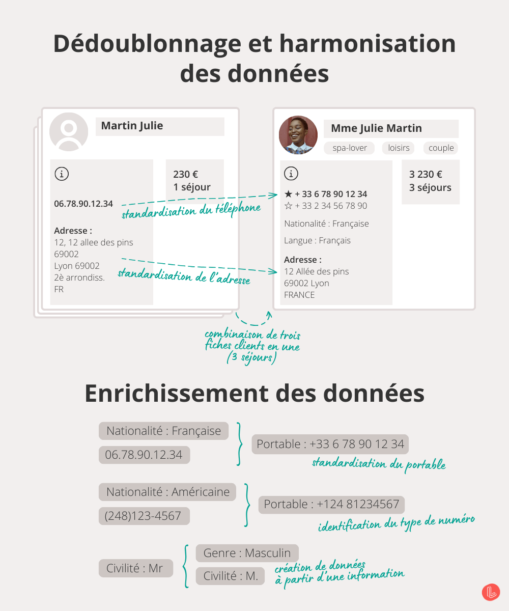 - Dédoublonner les données : Un client qui revient plusieurs fois ne doit pas être recréé plusieurs fois dans votre base de données, les séjours et les informations doivent se compiler sous son profil. Par exemple : deux numéros de téléphone identiques, l’un avec un indicatif au début (+336…) et un autre sans indicatif (06…)