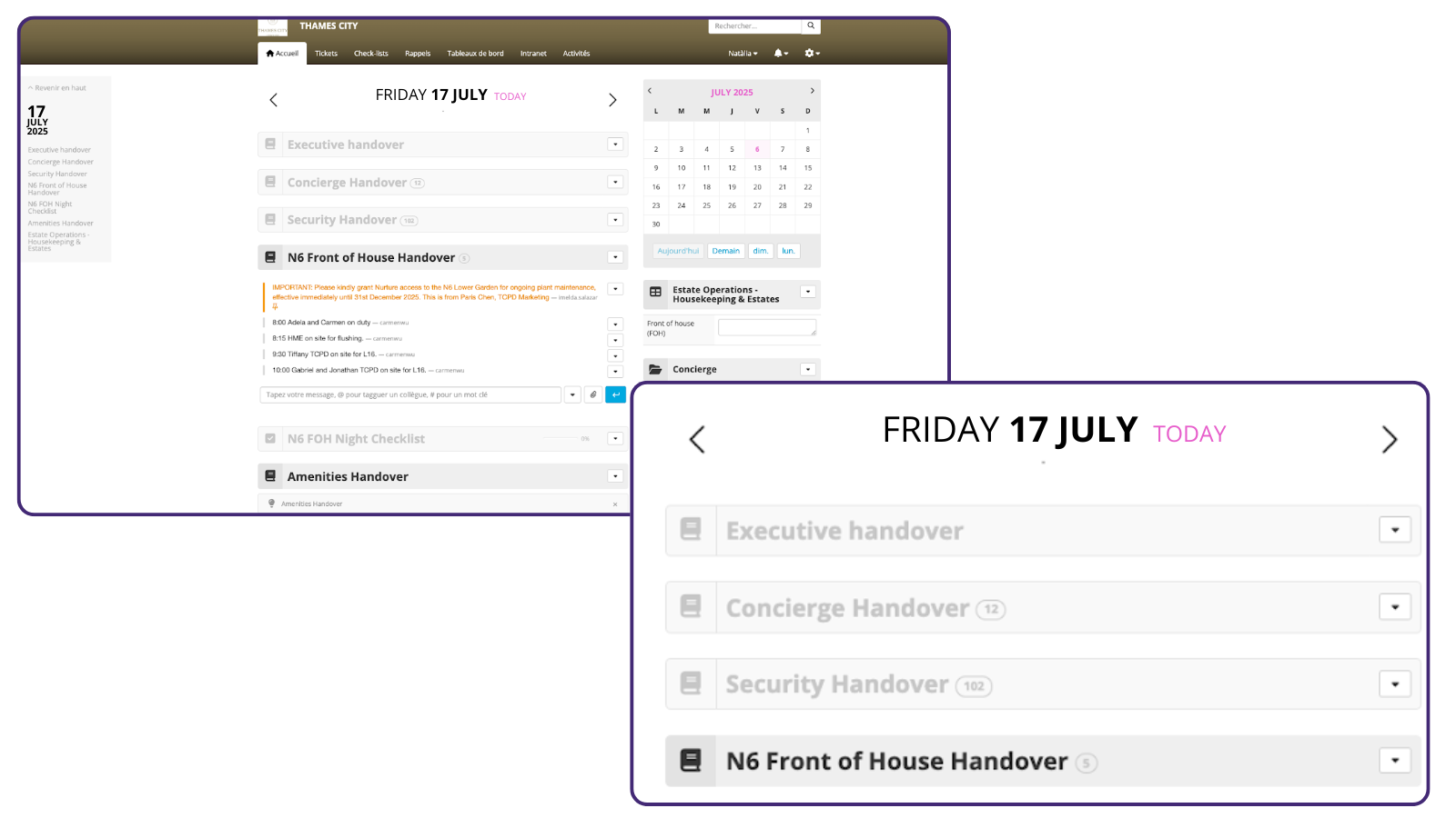 Avec plus d’un millier d’appartements et plusieurs équipes (conciergerie, sécurité, housekeeping…), la coordination interne est essentielle. Thames City avait besoin d’un outil simple mais puissant pour :