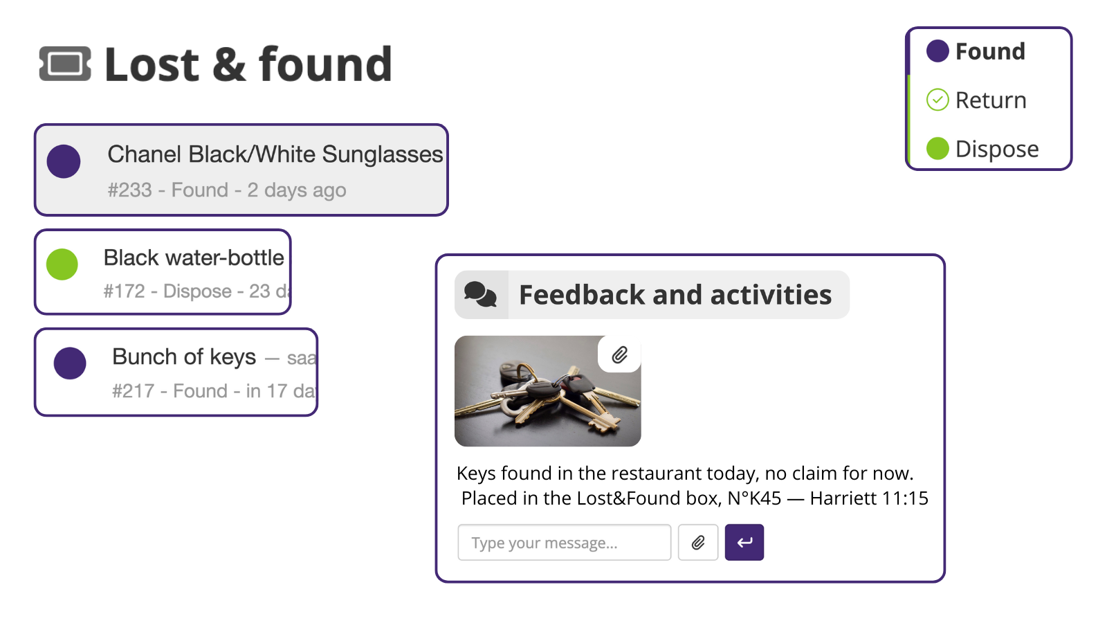 Comme tout établissement hôtelier, de nombreux objets sont oubliés par les clients ou trouvés par les équipes. Dmbook permet aux collaborateurs d’informer et de suivre les objets trouvés ou perdus et de s’assurer qu’ils sont rapatriés aux clients si ceux-ci souhaitent les récupérer.