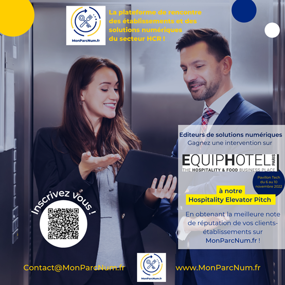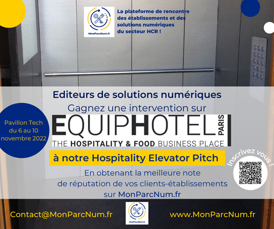 Lorsqu’un représentant d’une solution numérique reste bloqué 10 minutes dans un ascenseur avec un représentant d’un établissement CHR, les échanges sur les besoins et les opportunités numériques animent la cabine ! La plateforme MonParcNum.fr propose de scruter ces discussions lors des Hospitality Elevator Pitch qui se dérouleront durant EquipHotel 2022 tous les après-midis du 6 au 10 novembre dans le Pavillon Tech !