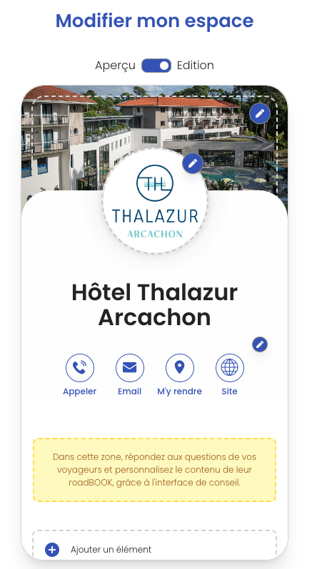 Chaque hôtel personnalise le contenu de son livret d’accueil : checkin checkout, foire aux questions, description des services de son établissement. L’hôtelier y ajoute les offres de services aux alentours qui répondent aux attentes de sa clientèle, contenus mis à jour par la destination !