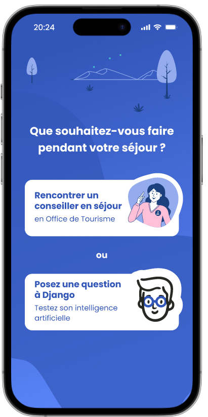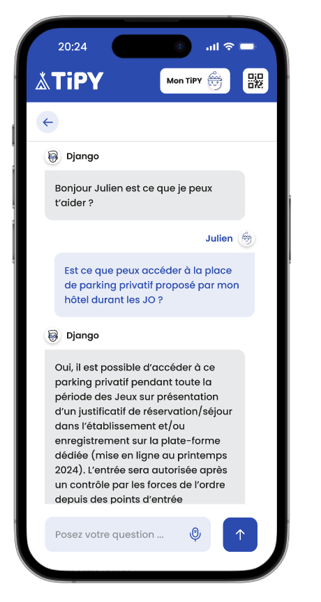 Le voyageur obtient une réponse immédiate à la question qu’il se pose, en utilisant le chatBOT Django intégré à son TiPY. Django est nourri de toute l’offre de la destination et répond en langage naturel.