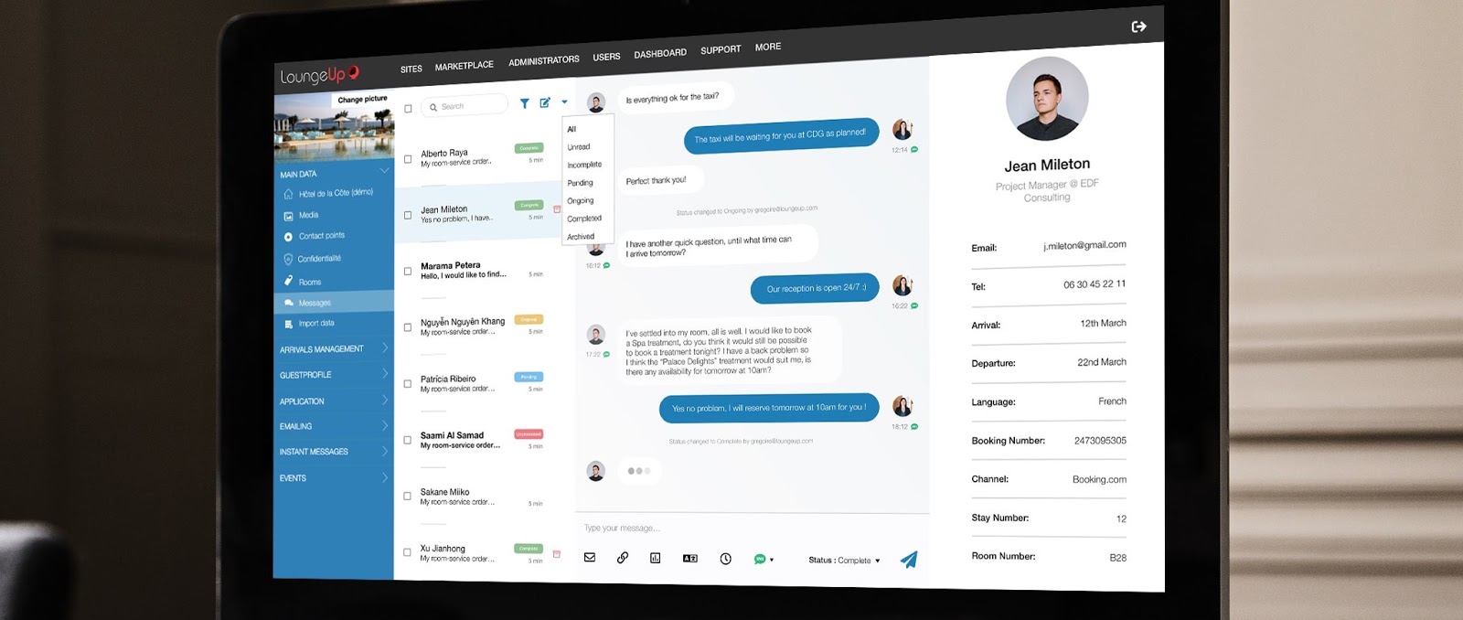 Les voyageurs utilisant de plus en plus la messagerie instantanée dans leurs interactions avec les hôtels, il devenait impératif d’optimiser la gestion de ces communications sur l’ensemble des canaux et de permettre de mieux gérer les requêtes clients. C’est ainsi qu’est né le nouveau hub de messagerie avec ses fonctions de gestion des statuts pour facilement trouver les demandes clients en cours, non traitées ou qui nécessitent un traitement particulier. Depuis son hub de messagerie, la réception peut gérer toutes les demandes entrantes de clients, accéder aux informations du client concerné, converser avec plusieurs clients, traduire en un clic les messages entrants ou sortants, programmer des messages et bien plus.