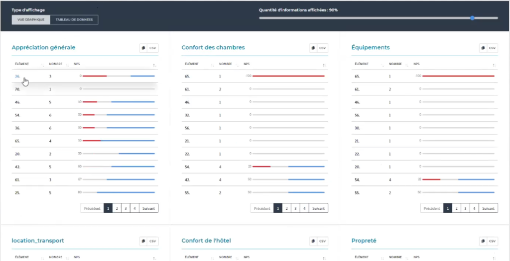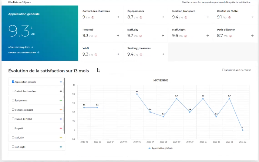 Connaître son taux de satisfaction client est essentiel afin de mettre en avant les éléments qui fonctionnent, mais surtout pour pouvoir agir sur ce qui ne va pas au sein de votre établissement. À travers les avis et commentaires laissés par vos clients suite aux enquêtes de satisfaction menées par votre hôtel, Experience vous permet une analyse complète, et vous donne des axes d’amélioration précis.