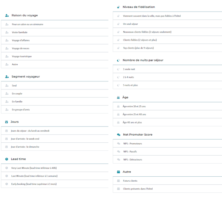 ● Le délai de réservation, ou lead time (lastminute, early booking…) ;