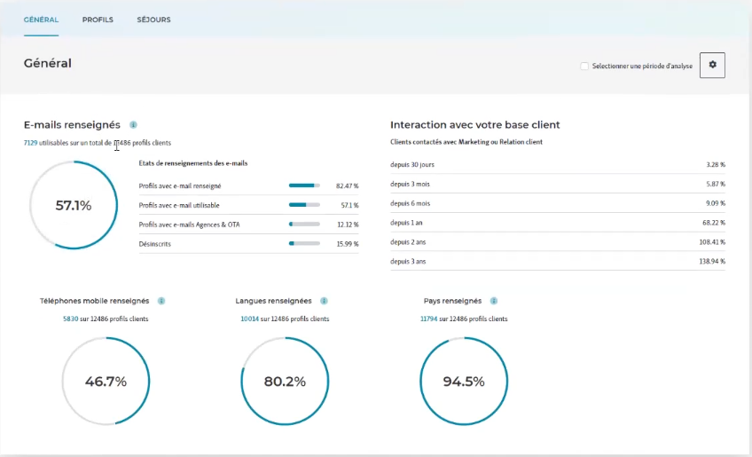Cela nous informe donc de plusieurs choses : premièrement, il manque beaucoup d’adresses mail, et il faut engager des actions efficaces afin de récupérer celles manquantes ou erronées (pré-stay, pre-check in, post stay, etc.). Deuxièmement, l’hôtel n’est pas très actif en termes de communication. Pourtant, il est nécessaire de nourrir sa clientèle d’emails marketing si vous souhaitez la fidéliser !