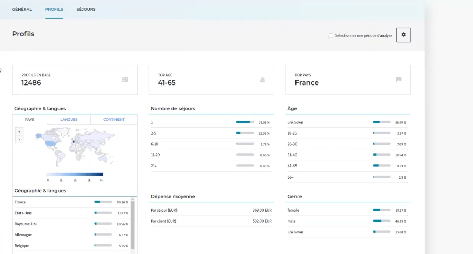 Sur ce même tableau de bord, vous pouvez également vous rendre compte que la majorité des clients résidant à l’hôtel ont entre 41 et 65 ans. Ces données, surprenantes, car l’hôtel en question semble plus s’adresser aux 25-35 ans, peut alors modifier la communication de l’établissement, son ton, le choix des sujets, etc.