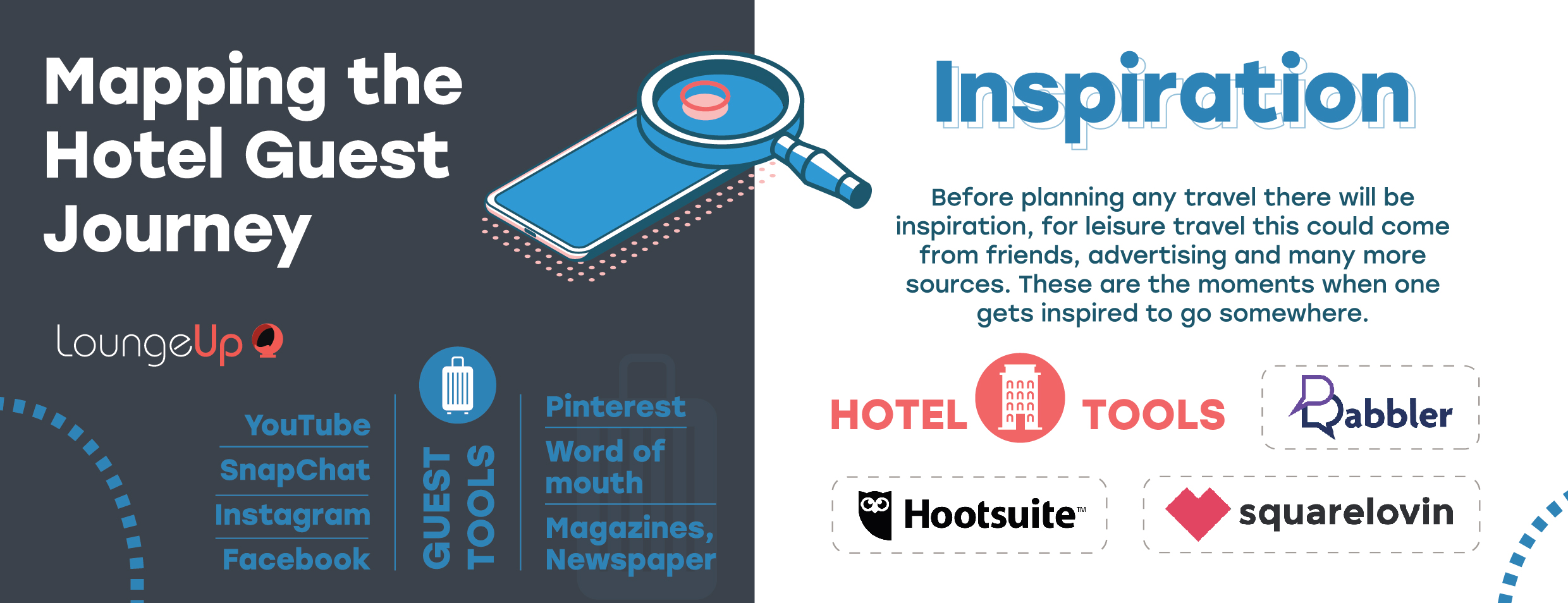 Avant la préparation de son voyage, le voyageur s’inspire de nombreuses sources comme ses amis, ses lectures ou la publicité. Cette étape est le moment où il trouve l’inspiration.
