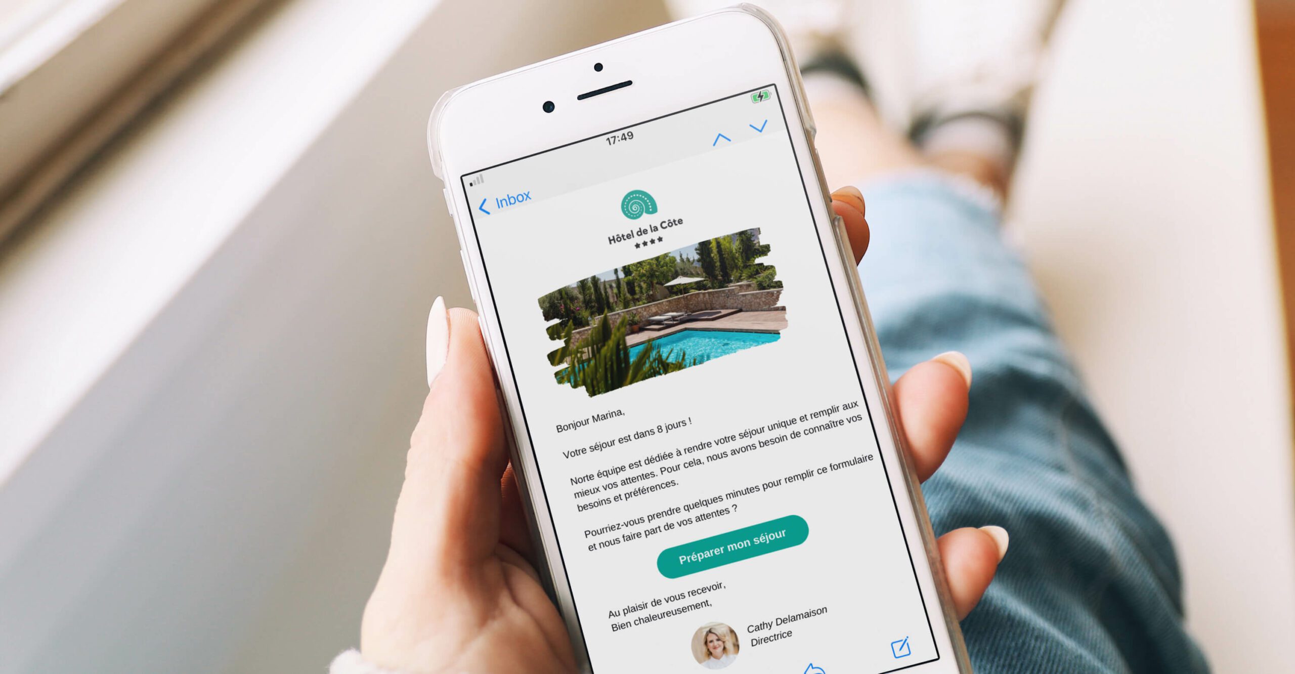 ❯ L’hôtel a ainsi programmé différentes campagnes pour suivre chaque client tout au long de son séjour. N’utiliser qu’un seul outil d’envoi pour les différents points de contact permet d’harmoniser la communication. Que ce soit la confirmation de la réservation, la présentation du portail client, la réservation de services additionnels, le formulaire de satisfaction post-séjour, les campagnes de fidélisation… toutes les campagnes sont envoyées avec la même plateforme ce qui renforce l’image de marque et facilite la lecture pour le client car la mise en forme, les messages, les formulaires, les signatures, l’expéditeur, etc. sont similaires.