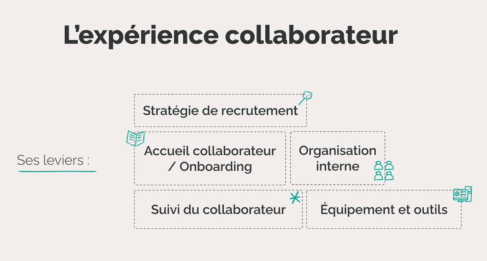 L’expérience collaborateur est constituée d’une succession d’étapes qui incluent chacune plusieurs éléments :