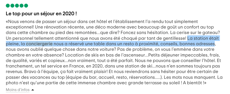 Et cela plaît aux clients qui saluent la disponibilité de la réception et la qualité de service offerte, comme le démontre cet avis client publié sur TripAdvisor, parmi les nombreux avis flatteurs laissés par les clients :