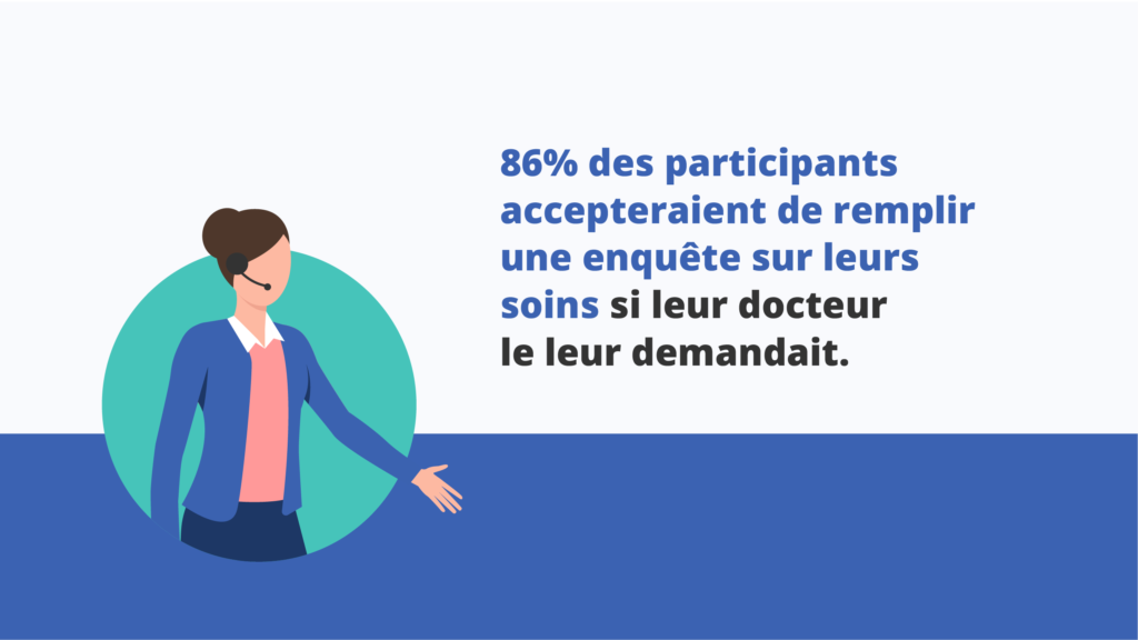 En plus, obtenir des réponses est plus simple que ce que vous pensez ! Une étude menée par West Corporation a montré que 86% des participants accepteraient de remplir une enquête sur leurs soins si leur docteur le leur demandait (1).