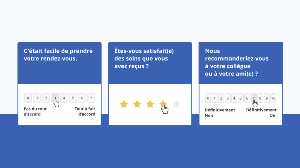 Vous pouvez recueillir des avis sur tout un tas de sujets, mais il est important de ne pas submerger vos patients de questions. Concentrez-vous plutôt sur ces trois domaines principaux, et ne posez que les questions les plus importantes. Cela vous permettra également d’obtenir un taux de réponses plus important et des retours encore plus précieux.