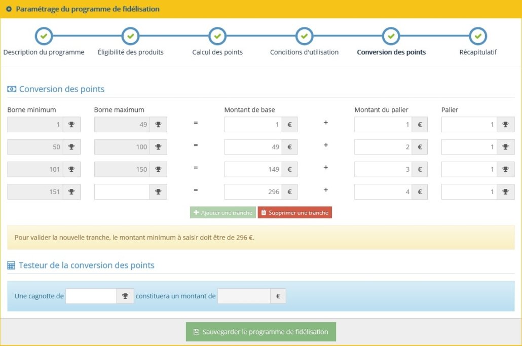 Enfin, les points sont traduits en devise. Il est possible de créer autant de tranches que nécessaire.