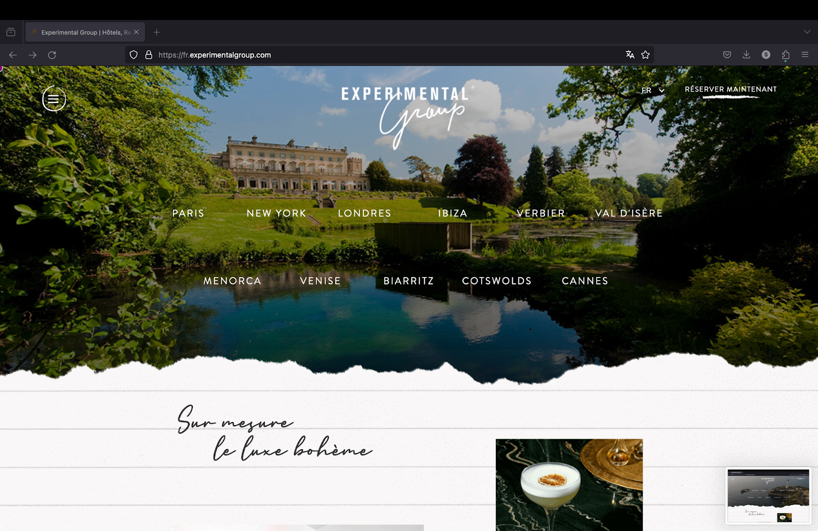 1. Minimalisme et présentation épurée: le rapport Webflow2 souligne l’importance d’une structure claire dans la présentation des informations aux visiteurs. Plus que jamais, la durée d’attention sur Internet diminue, et plus que jamais, les visiteurs ressentent le besoin d’avoir un accès immédiat à des informations pertinentes3. Les sites web des hôtels doivent donc offrir une expérience intuitive, sans encombrement du contenu et de l’information. Cet aspect est particulièrement important dans le segment de l’hôtellerie de luxe. Dans la conception de votre site web, mettez l’accent sur la facilité de navigation et la clarté, car cela permet de mettre en valeur les caractéristiques des propriétés de luxe sans submerger le visiteur, renforçant ainsi l’entonnoir intuitif qui mène à la réservation. Le site web de notre client Experimental est un exemple de site web clair, élégant et direct.