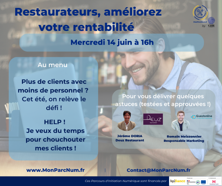 Jérôme Doria reçoit Romain Meissonnier le mercredi 14 juin à 16h pour un webinaire exclusif réservé aux restaurateurs pour améliorer la rentabilité de chaque table et chaque service !