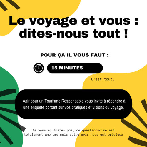 Afin de mieux comprendre les envies et motivations des voyageurs.ses, présentement et dans les années à venir, ATR lance une enquête d’une trentaine de questions structurée autour de trois piliers : Vos habitudes de voyage – Le voyage responsable et vous – Le voyage bas carbone. Quel est l’attrait des voyageurs.ses français.es pour un tourisme plus responsable, bas carbone ? Qu’est-il compris de ces termes ? Quels freins à leur développement ? Les données récoltées permettront ainsi de dresser un tableau plus précis des besoins, contraintes et connaissances des voyageurs.ses, afin d’orienter au mieux l’action de l’ensemble des professionnel.les du tourisme engagé.e.s.