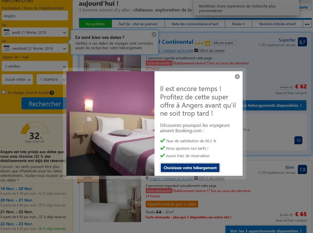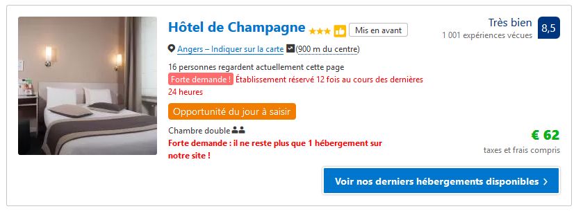 Forte demande, 16 personnes regardent actuellement cette page, établissement réservé 12 fois au cours des dernières 24 heures, opportunité du jour à saisir, il ne reste plus qu’un hébergement sur notre site… Tout est fait pour vous pousser à réserver rapidement, c’est ce que l’on appelle le stress marketing.