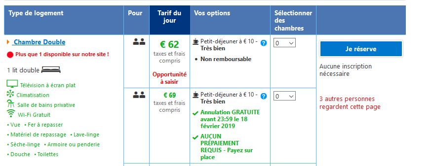 On retrouve les mêmes éléments de stress marketing mais également des éléments rassurants… annulation gratuite, aucun prépaiement requis, payez sur place… Afin de faire tomber les freins à la réservation. Vous vous dites, bon il n’y a plus beaucoup de place et je peux annuler plus tard si besoin donc je ne risque rien !
