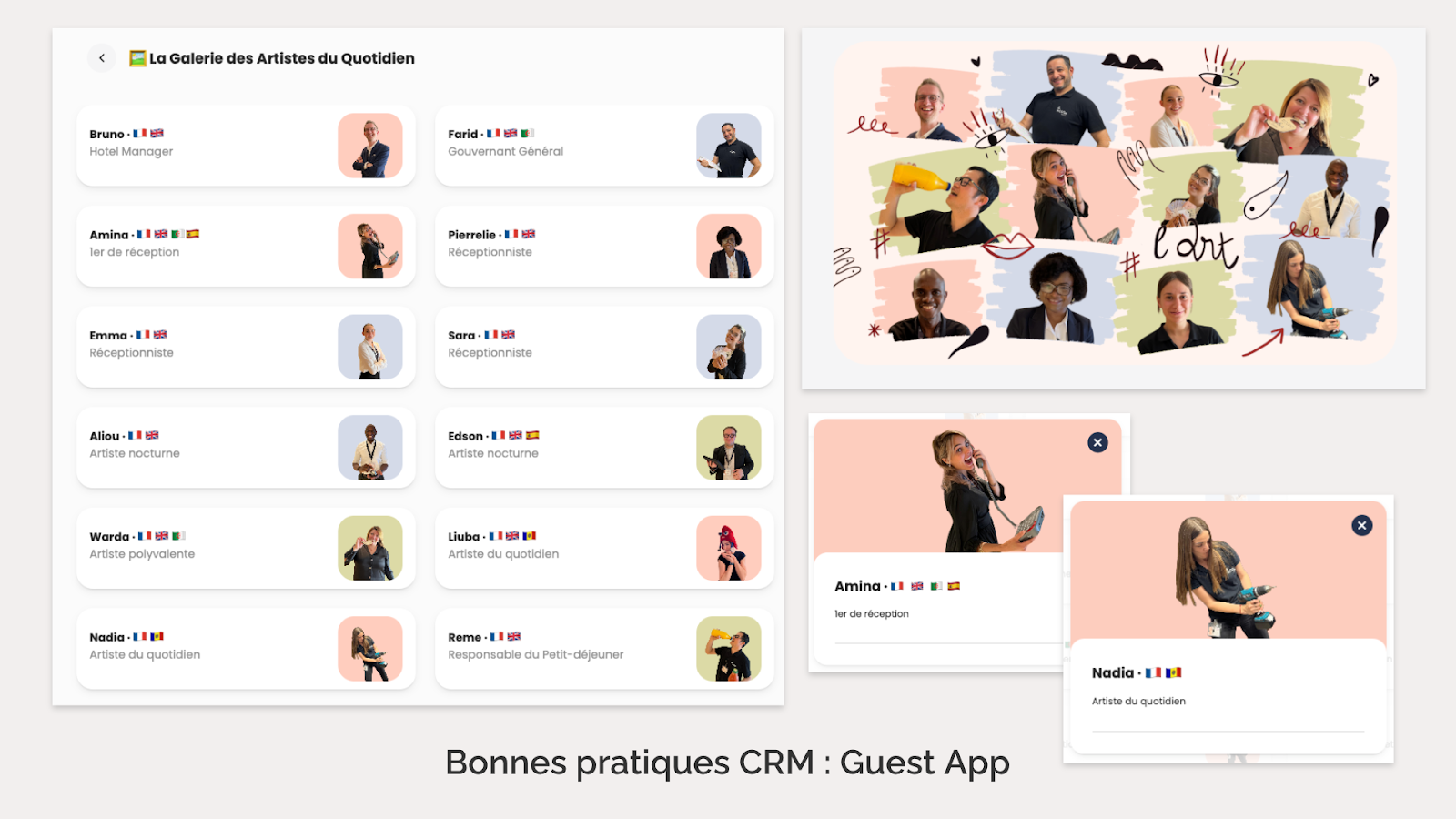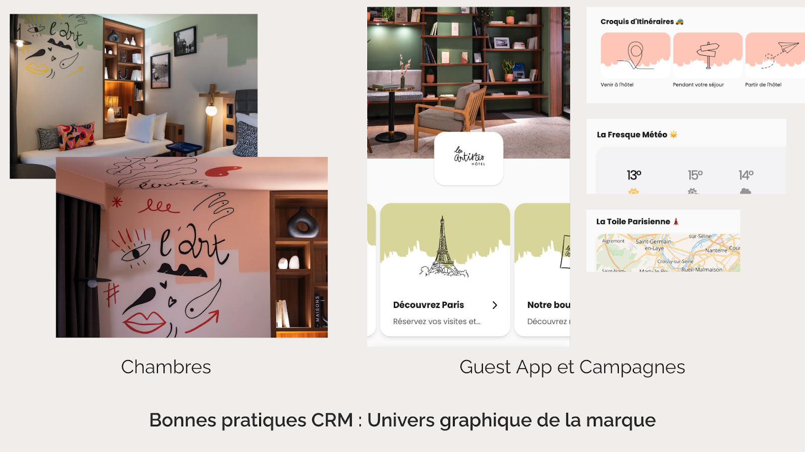 Pour offrir une expérience client immersive, l’identité visuelle doit rester cohérente sur tous les supports digitaux. Cela passe par des éléments graphiques rappelant les coups de pinceau visibles dans les chambres, ainsi que par un champ lexical artistique dans la Guest App : “croquis d’itinéraires” pour les transports, “fresque météo”, ou encore “toile parisienne” pour la carte interactive.
