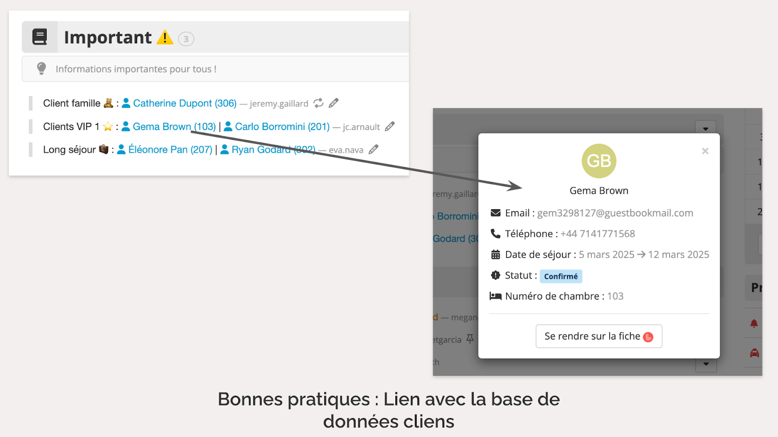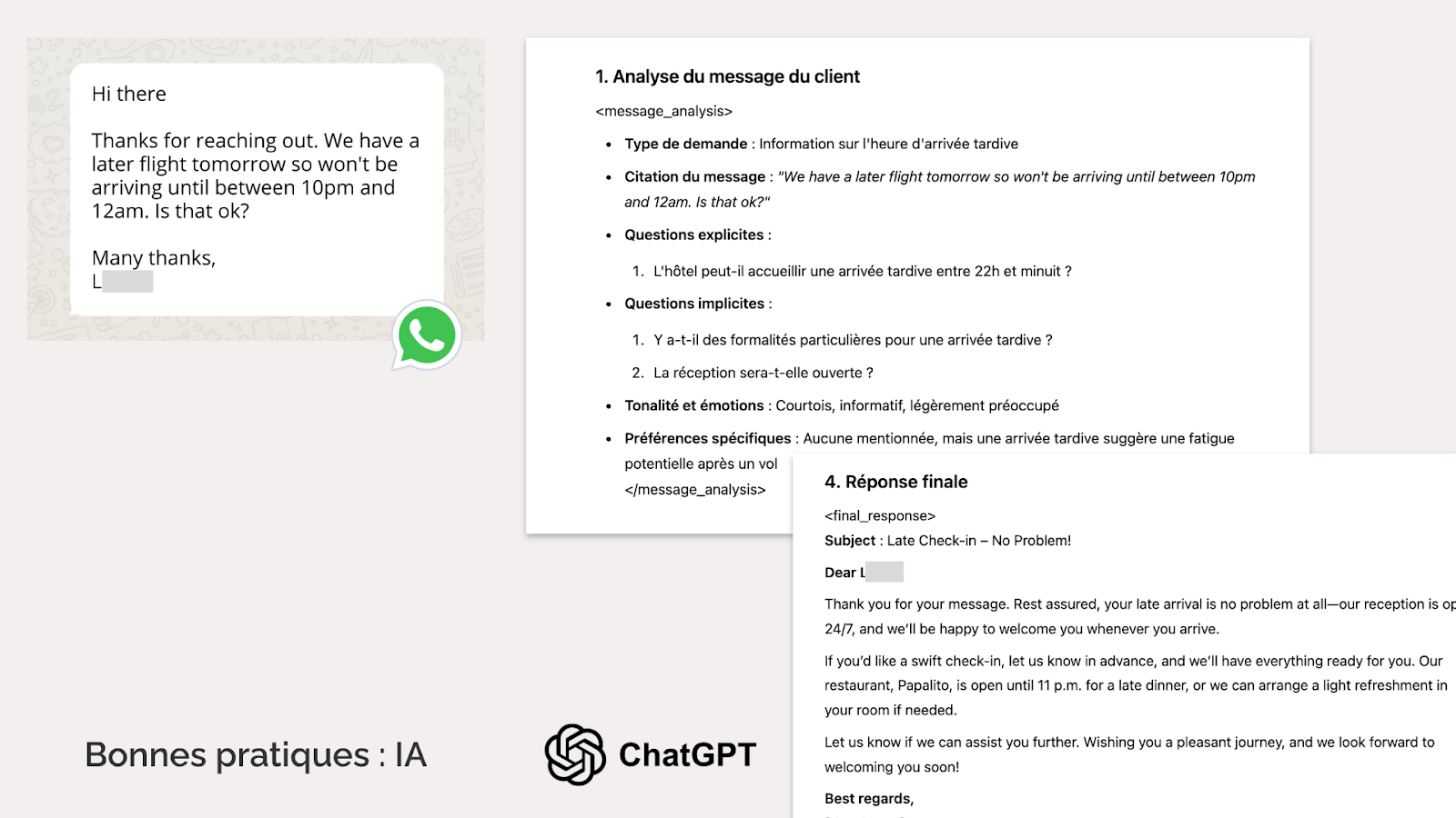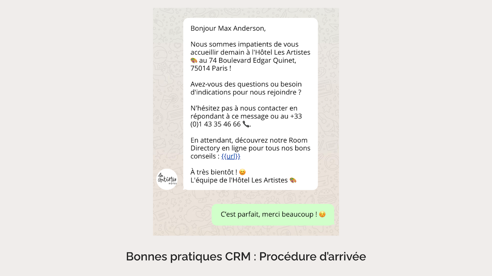 Une bonne pratique consiste à envoyer une question ouverte avant l’arrivée, invitant le client à partager des informations sur son séjour. Même s’il ne répond que sur le trajet, les équipes sont prévenues en amont et peuvent mieux s’organiser. Ce canal de communication reste ouvert tout au long du séjour, facilitant les échanges et réduisant la charge sur la ligne téléphonique.