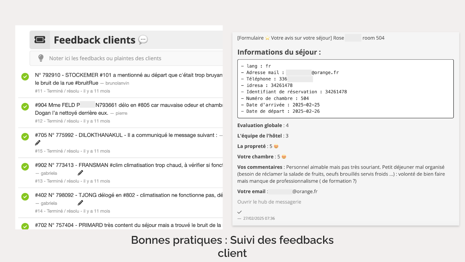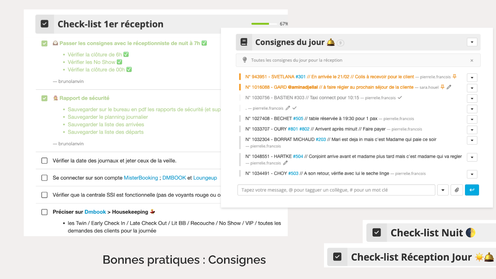 Les check-lists sont essentielles à tous les niveaux : réception, réception de nuit, etc. Elles sont également très utiles pour les extras, en leur fournissant les procédures à suivre. Avec l’intégration de photos et vidéos, les employés deviennent autonomes plus rapidement, et chaque tâche est cochée, ce qui aide à bien répartir les tâches entre les collaborateurs et à se coordonner efficacement.