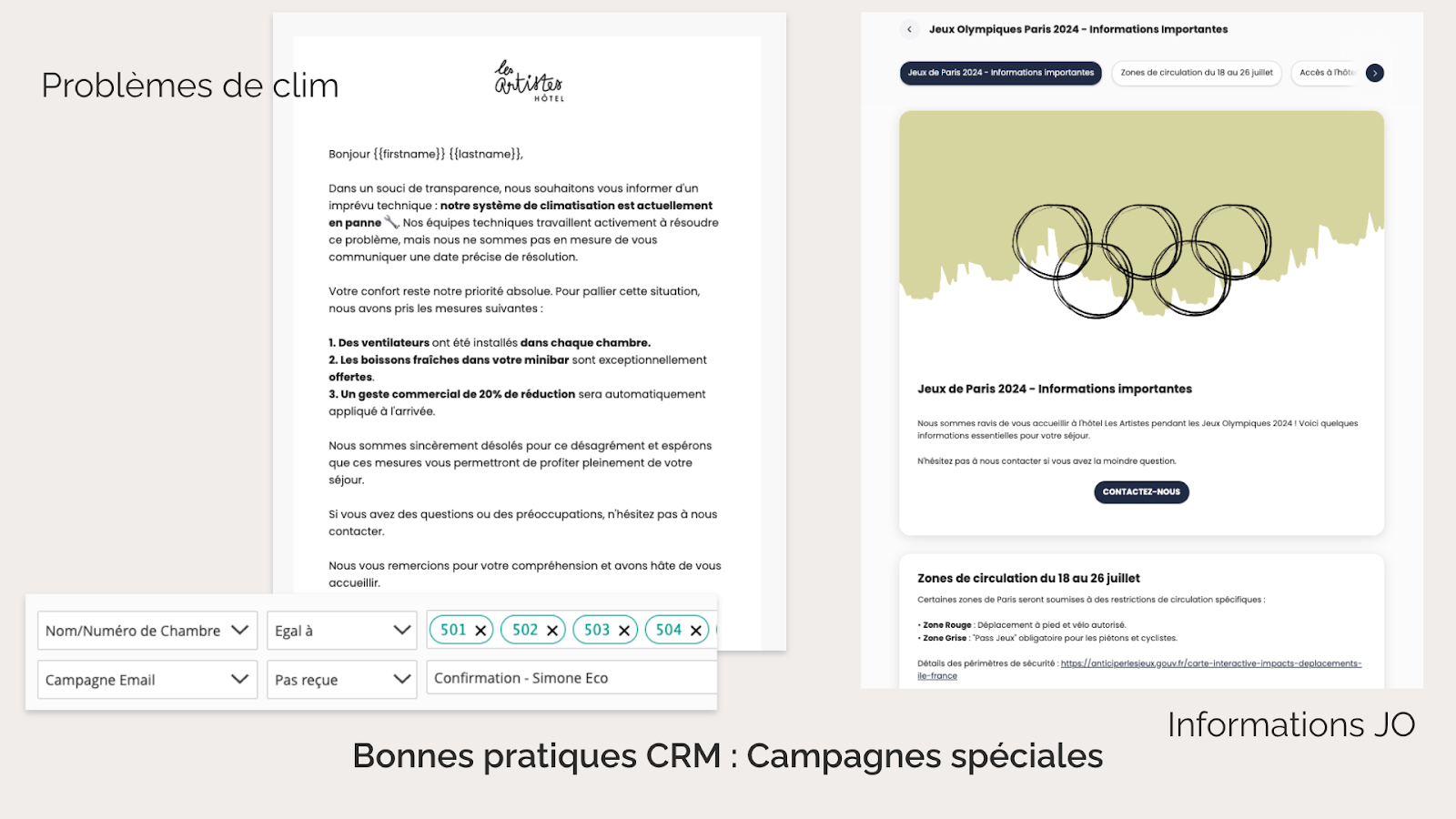 La flexibilité des campagnes permet à l’hôtel d’être extrêmement réactif face à des situations exceptionnelles, comme une climatisation en panne en été ou les conditions de transports et de visite durant les Jeux Olympiques de 2024. Grâce au ciblage par type de chambre et dates de séjour, les clients concernés sont informés en amont, avant même d’être confrontés au problème.