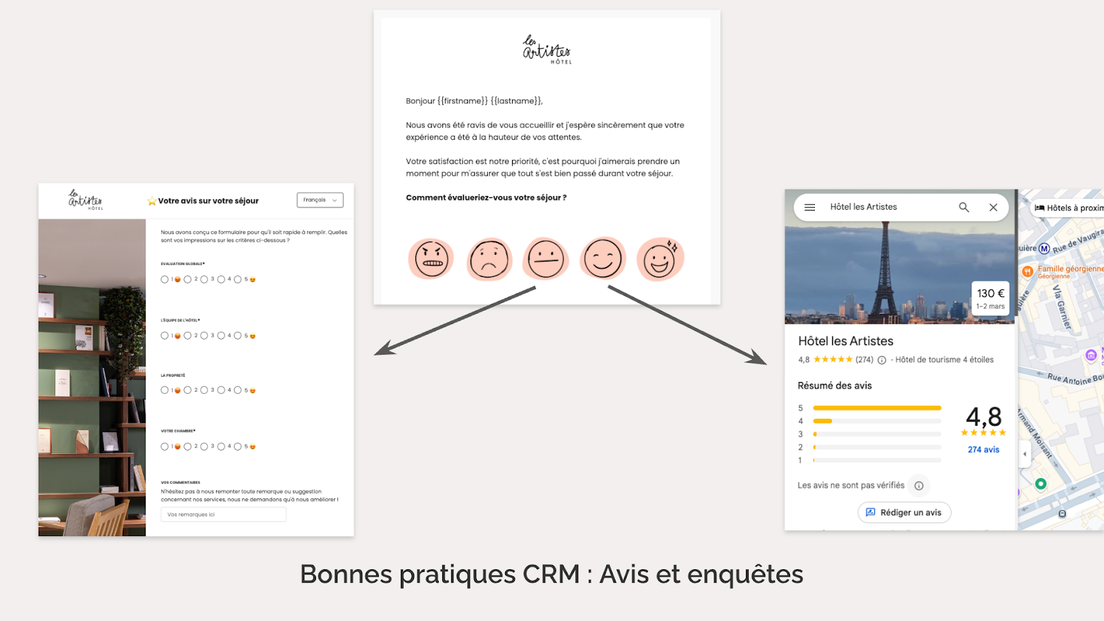 Si un client est peu satisfait (1 à 3 étoiles sur 5), il reçoit une enquête interne envoyée par le Directeur. En revanche, si le client est satisfait (4 à 5 étoiles sur 5), il est dirigé vers Google ou TripAdvisor pour laisser son avis.