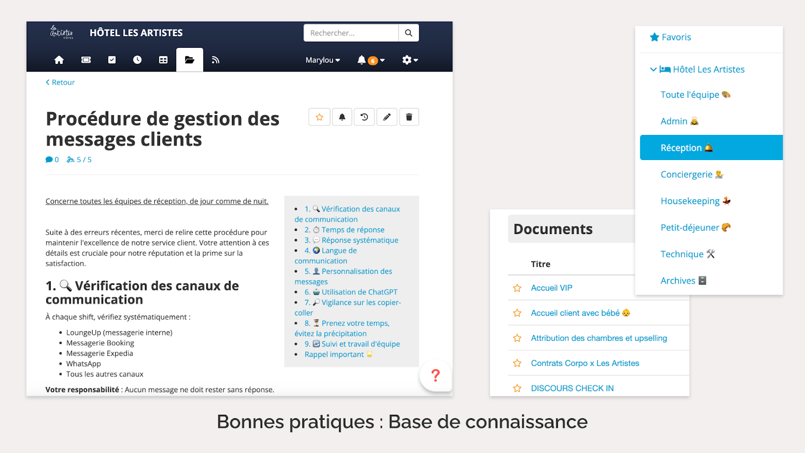 La gestion de la connaissance interne est cruciale, et il faut désigner une personne responsable de sa transmission et régulation. Fini les procédures partagées par e-mail ou sur des documents volants : tout est centralisé dans cet outil.