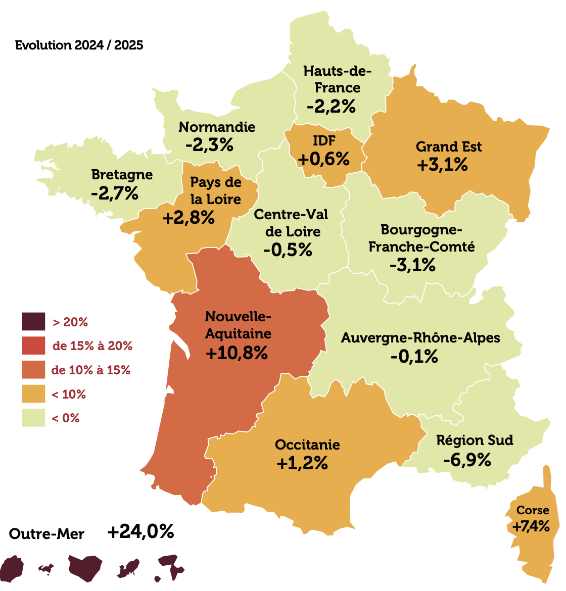 Quatre autres territoires affichent une augmentation supérieure à la moyenne nationale : la Corse (+ 7,4 % ; 393), le Grand Est (+ 3,1 % ; 4 339), les Pays de la Loire (+ 2,8 % ; 2 639) et l’Occitanie (+ 1,2 % ; 5 565).