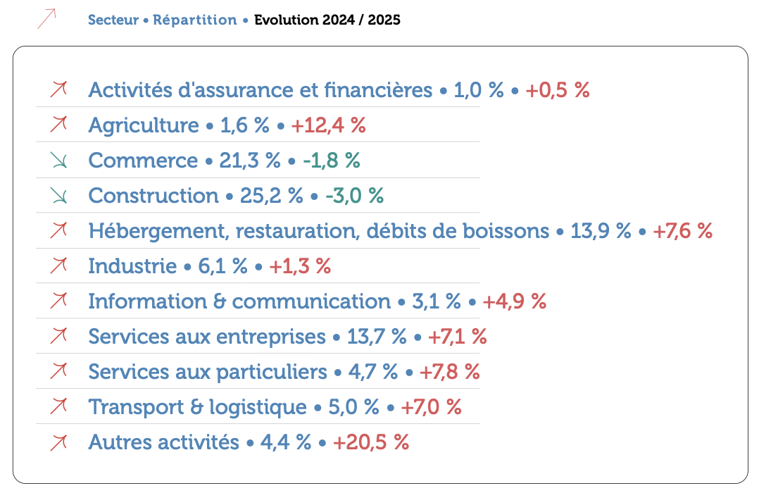 À l’inverse, la Provence-Alpes-Côte d’Azur présente la plus forte baisse en 2025, avec un recul de 6,9 % (5 813 entrepreneurs). Elle devance la Bourgogne-Franche-Comté (- 3,1 % ; 2 010) et la Bretagne (- 2,7 % ; 2 241).