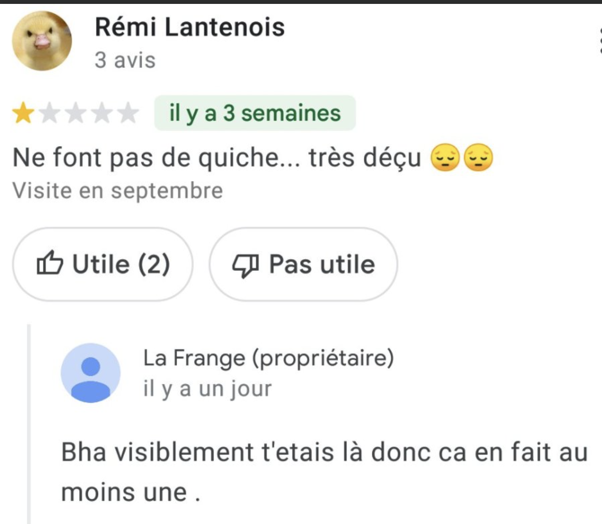 Pour donner ce sentiment de personnalisation, vous pouvez reprendre des éléments de langage de l’avis tel que “Merci pour votre retour sur notre petit-déjeuner. En effet, nous utilisons des produits frais et variés” et ajouter une signature du type “Thibaut et son équipe”.