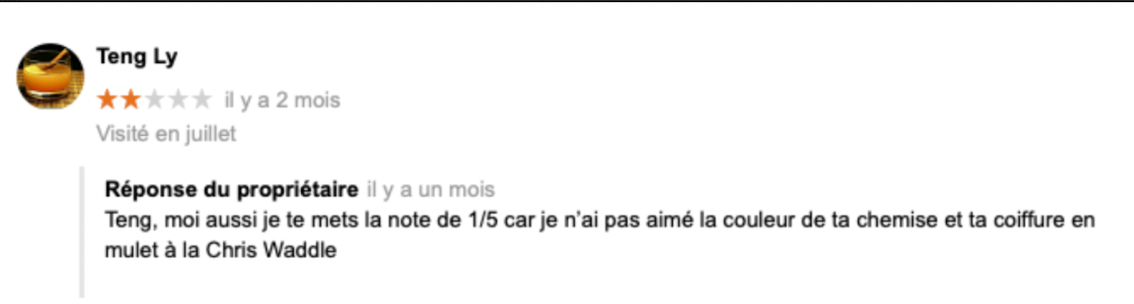 Exemple de réponse : “Bonjour, Merci beaucoup d’avoir pris le temps de partager votre avis sur notre établissement xx. Nous apprécions vos commentaires et nous prenons vos préoccupations très au sérieux.”