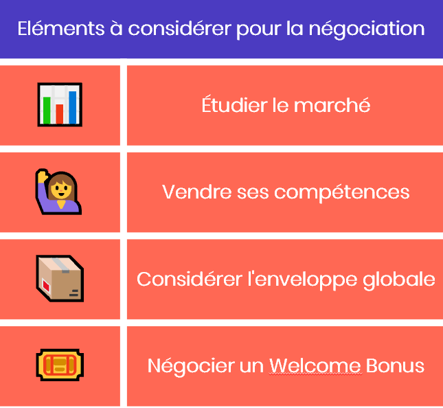 Enfin, si l’entreprise ne peut proposer un salaire fixe à la hauteur des attentes du candidat, il est possible de demander un « welcome bonus ». Cette prime à l’embauche qui commence à être démocratisée, peut atteindre plusieurs mois de salaire.