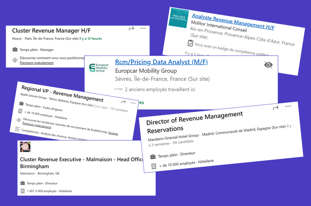 D’autres intitulés viennent compléter cette liste : on pensera notamment aux postes d’expériences : RDRM, Regional Director of Revenue Management ; VP, Vice-Président ; SVP, Sénior Vice-Président voir CRO, Chief Revenue Officer. Ils englobent des enjeux stratégiques toujours plus importants pour des groupes leaders de l’industrie. Leur présence est bien évidemment liée avec la taille de l’entreprise et des enjeux commerciaux.