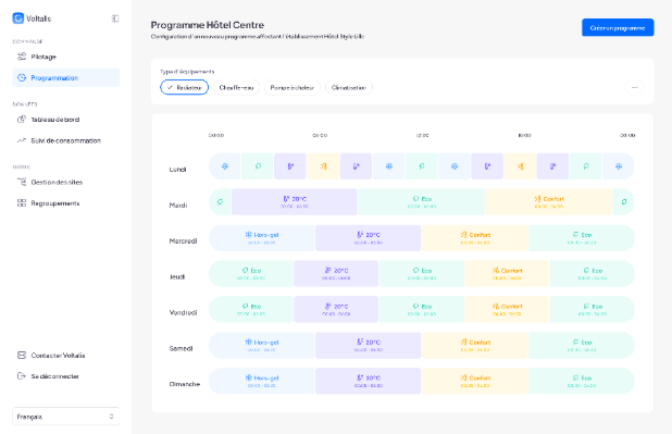Voltalis a donc travaille avec les professionnels du secteur afin d’habiller sa gamme Voltalis Business SolutionsTM pour respecter la réglementation et gagner en simplicité opérationnelle. Notre solution : une interface de gestion centralise e qui permet de piloter chaque radiateur a distance en fonction de scenarios prédéfinis et des automatisations de pendant de l’occupation des chambres. Voltalis permet ainsi de de finir différentes façons de consommer a l’échelle d’une résidence, d’un étage ou me me d’une chambre ; et pour ces dernières de manière automatique grâce au travail fait par Voltalis pour connecter les outils de réservation d’hôtel a sa plateforme Voltalis Business SolutionsTM, via l‘option FlexRoom.