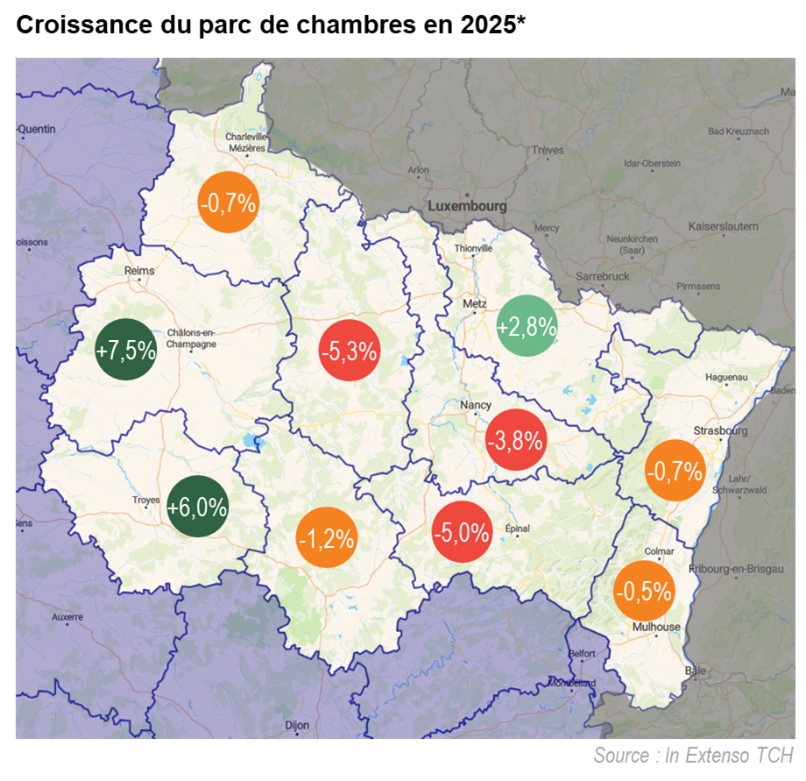 - Vosges (-5,0%), Meuse (-5,3%), Meurthe-et-Moselle (-3,8%) : poursuite d’une tendance observée depuis 10 ans, la disparition d’hôtels périurbains d’entrée de gamme (4 HotelF1 sortis du marché sur ces départements en 2025).