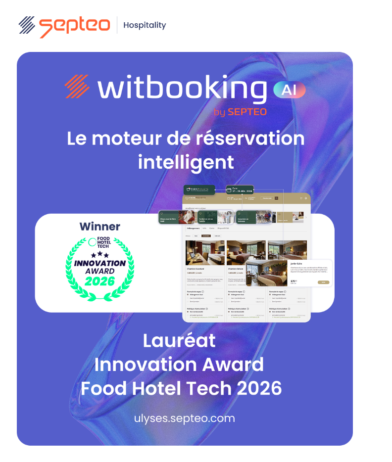 Lattes, le 17 avril 2026 — Septeo Hospitality a remporté le mercredi 15 avril 2026, l’Innovation Award décerné lors du salon Food Hotel Tech 2026 pour Witbooking AI, son moteur de réservation intelligent propulsé par l’intelligence artificielle.