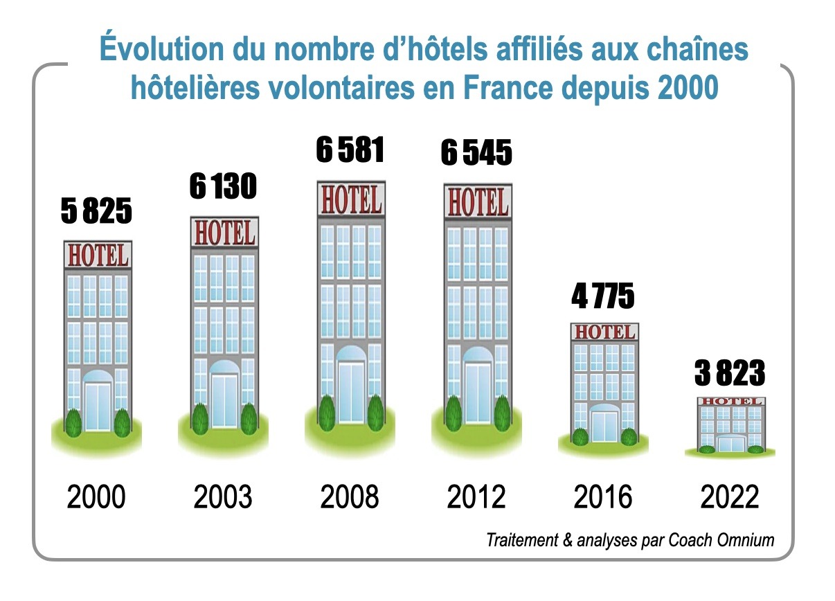 Avec 24 enseignes recensées par Coach Omnium, le catalogue en nombre d’adresses des chaînes volontaires en France se réduit fortement depuis ces dernières années. Qu’on en juge. Il y avait jusqu’à près de 6.600 hôtels en 2008. On n’en compte plus que 3.823 aujourd’hui, soit une perte de – 42 % — voir graphique. Ce n’est plus une fuite de membres mais une véritable hémorragie ! Et encore, près de 10 à 15 % des hôteliers adhèrent à au moins deux chaînes différentes.