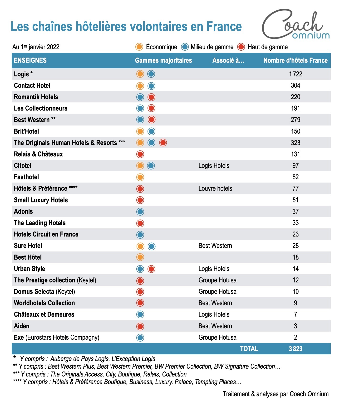 Méthodologie : Cette étude exclusive et indépendante est réalisée pour la 23e année par la société d’études marketing & économiques Coach Omnium, à compte d’auteur. Indépendante de tout groupe hôtelier, elle répertorie les chaînes hôtelières étrangères et françaises présentes en 2022 en France métropolitaine (hors Dom-Tom). Les informations publiées dans cette étude ont été analysées et contre-vérifiées par nos services avec soin. Toutefois, les données fournies ou publiées par les chaînes hôtelières concernées n’engagent que leurs auteurs. Informations non contractuelles. Cette étude est protégée par un copyright Coach Omnium – ©2022. Toute reproduction et diffusion sont interdites sans l’autorisation préalable de Coach Omnium.