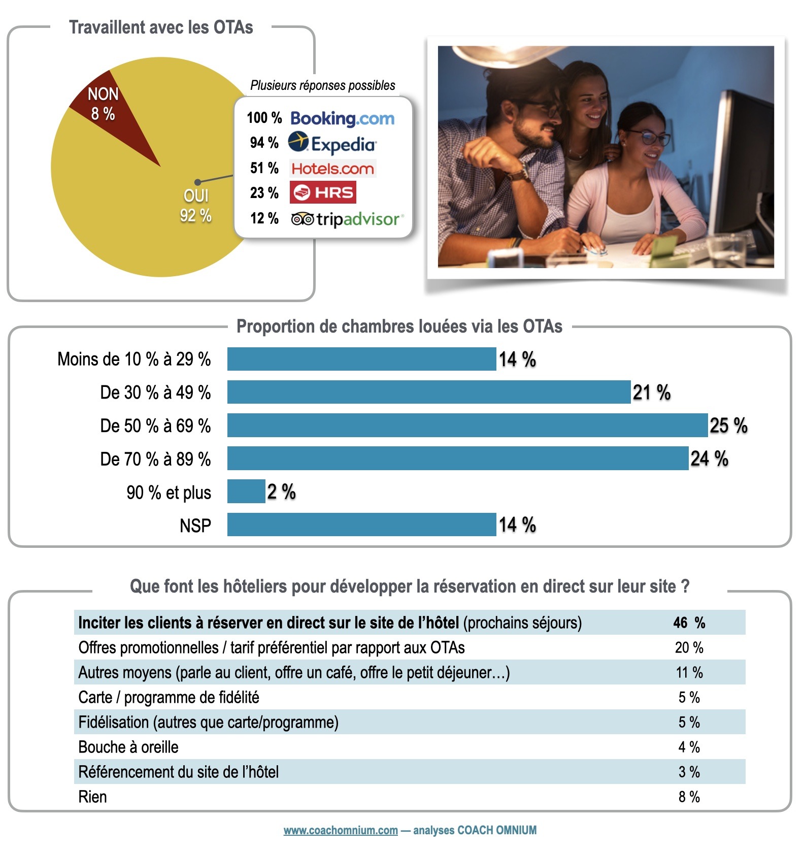 • Si les clients peuvent admettre que les hôteliers n’aiment pas travailler avec les OTAs — mais alors, comment comprendre qu’ils s’y affilient ? —, il est difficile de convaincre les voyageurs de tourner le dos à ces plateformes. 66 % des clients d’hôtels (français et étrangers) passent par des OTAs pour réserver leurs séjours. D’autant plus que 88 % des voyageurs sont satisfaits des plateformes en ligne, ce qui est moins le cas des sites d’hôtels ou de chaînes. Quant au prosélytisme consistant à culpabiliser les clients de passer par les OTAs, il va de soi que c’est une très mauvaise idée.
