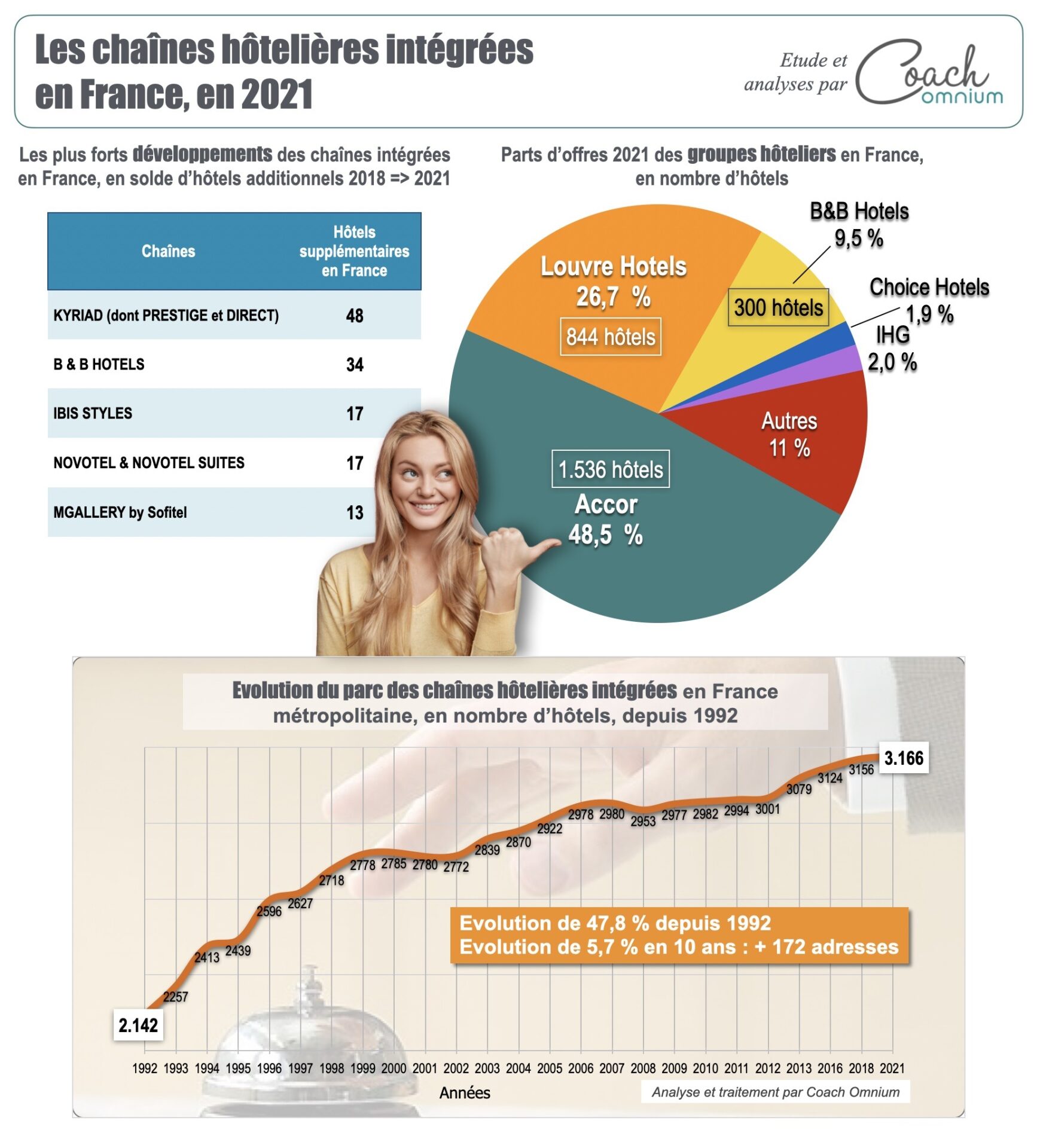 Les chaînes hôtelières intégrées fédèrent aujourd’hui en France, 3.166 hôtels pour 268.727 chambres sous 90 enseignes différentes recensées par Coach Omnium. Cela représente, encore une fois, presque 1 hôtel français sur 5. Dans les autres pays européens, la pénétration des chaînes va de 2 % à 11 % en moyenne, au maximum. La France est donc en quelque sorte le principal terrain de jeux des chaînes hôtelières en Europe.