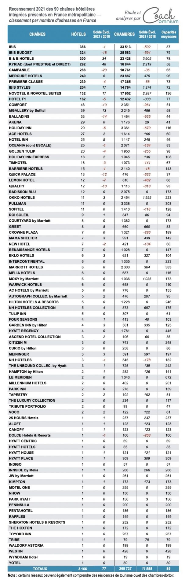 • Méthodologie : Cette étude exclusive est réalisée dans sa 24e édition depuis 1991 par la société d’études marketing & économiques Coach Omnium, à compte d’auteur. Indépendant de tout groupe hôtelier, l’étude répertorie les chaînes hôtelières présentes en France métropolitaine (hors Dom-Tom). Les informations publiées dans cette étude ont été analysées et contrevérifiées par nos services avec soin. Toutefois, les données fournies par les chaînes hôtelières concernées n’engagent que leurs auteurs via les sites des groupes hôteliers, rapports annuels, documents destinés aux investisseurs faisant état du parc hôtelier, conférences de presse des enseignes et autres sources. Informations non contractuelles. Cette étude est protégée par un copyright Coach Omnium – ©2021.