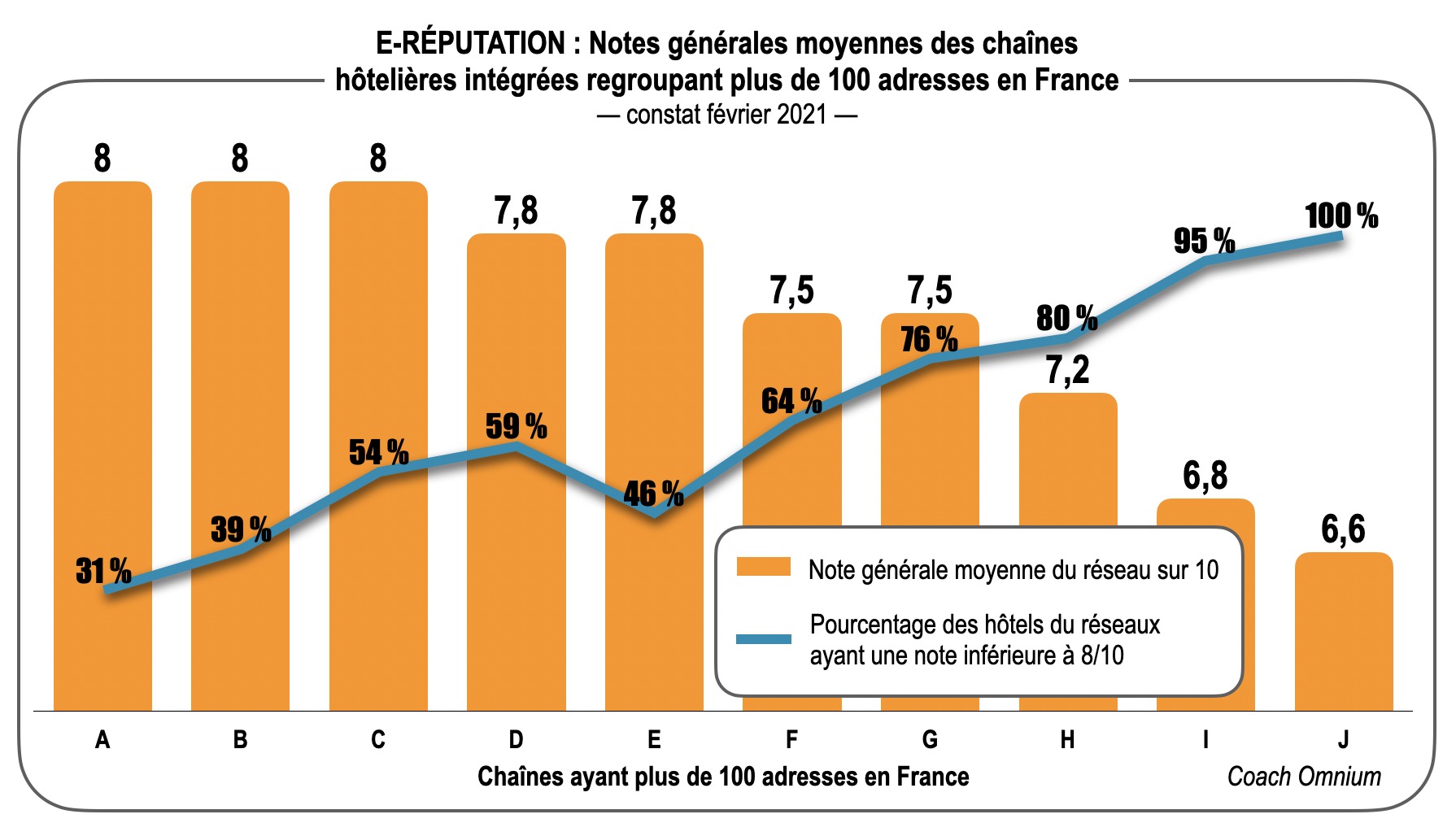 Nous venons de réaliser une étude sur l’e-réputation et les notations déposées par les clients sur les hôtels des grandes chaînes présentes en France, celles qui ont plus d’une centaine d’adresses et qui sont une dizaine. Le résultat est à la fois surprenant et affligeant.