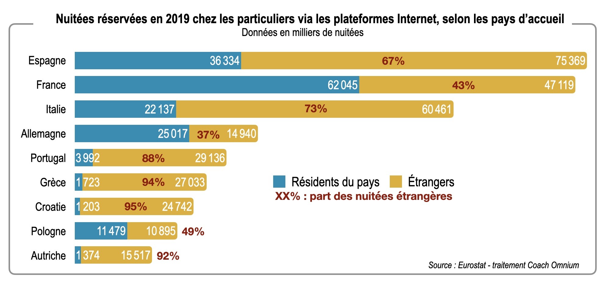 Ces quatre plateformes citées ont généré 554 millions de nuitées dans les hébergements chez des particuliers, soit une moyenne de 1,5 million de touristes par jour dans l’UE. Trois pays concentrent à eux seuls 55 % de ces nuitées : l’Espagne et la France, avec chacun près de 20 % de la demande (respectivement 111 et 109 millions de nuitées), suivis par l’Italie (15 %).
